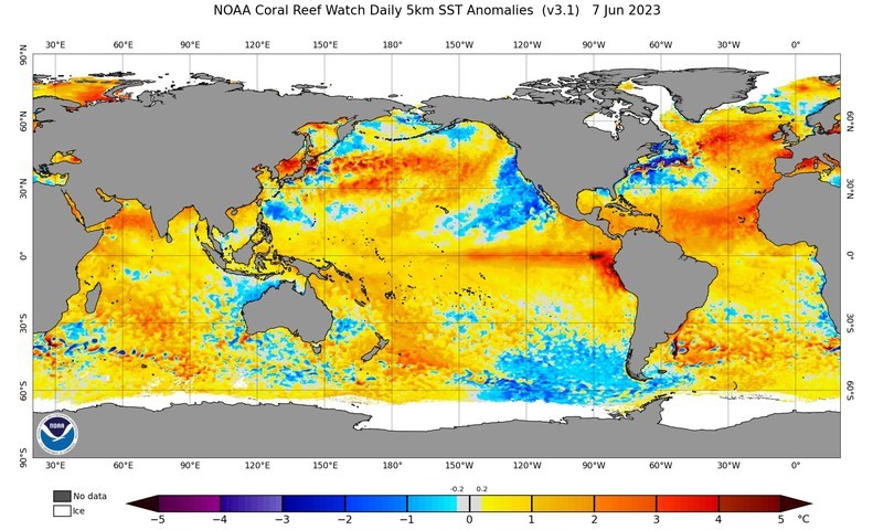 Images: Observed Pacific Ocean sea surface temperature anomalies on February 7 (top) and June 7 (bottom), showing the rapid transition between La Niña and El Niño patterns in 2023. Source: NOAA.