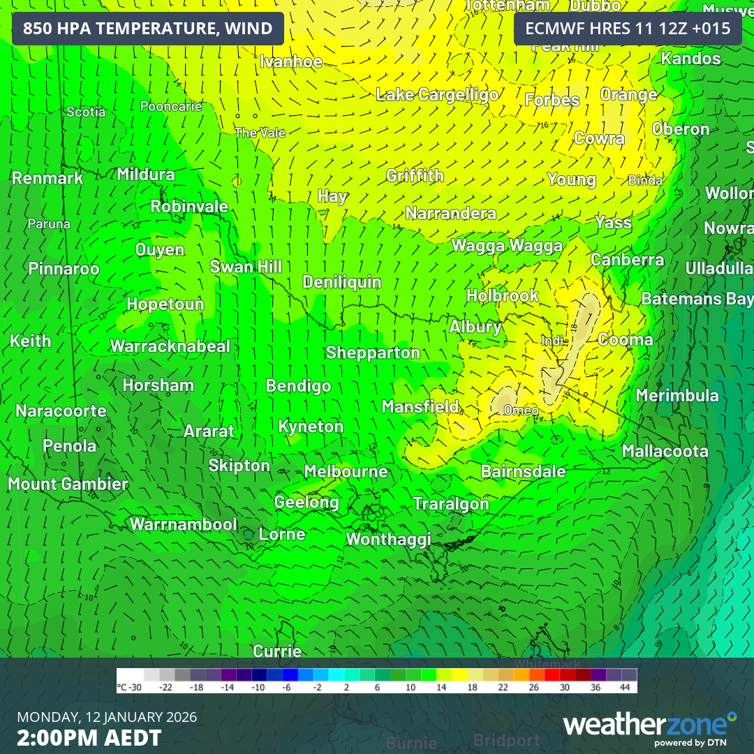 Image: 850hpa temperature and winds for Victoria on the afternoon of Monday, January 12, 2026. 850hpa corresponds to approximately 1500m above sea level. The “feathers” on the wind barbs (small lines sticking out from the longer lines) are positioned at the end of the barb from which the wind is blowing.