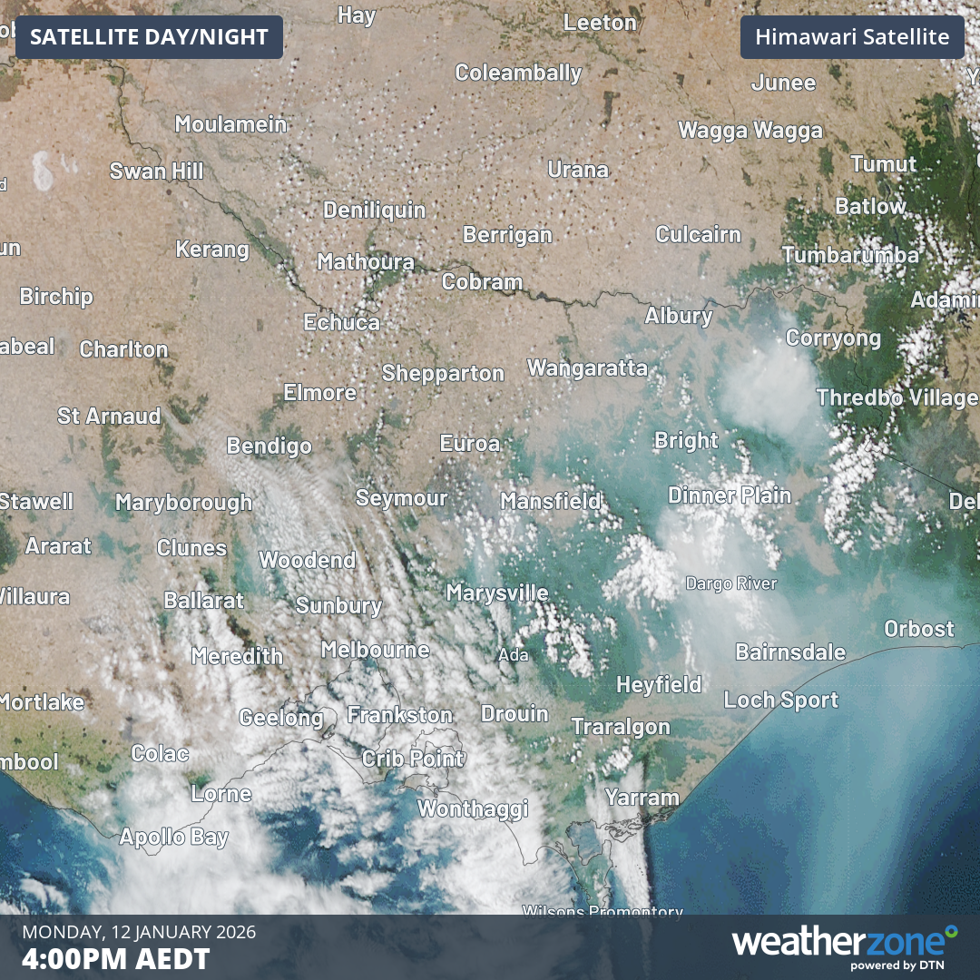 Image: Satellite view of the Victorian bushfires at 4pm (AEDT) on Monday, December 12, 2026.