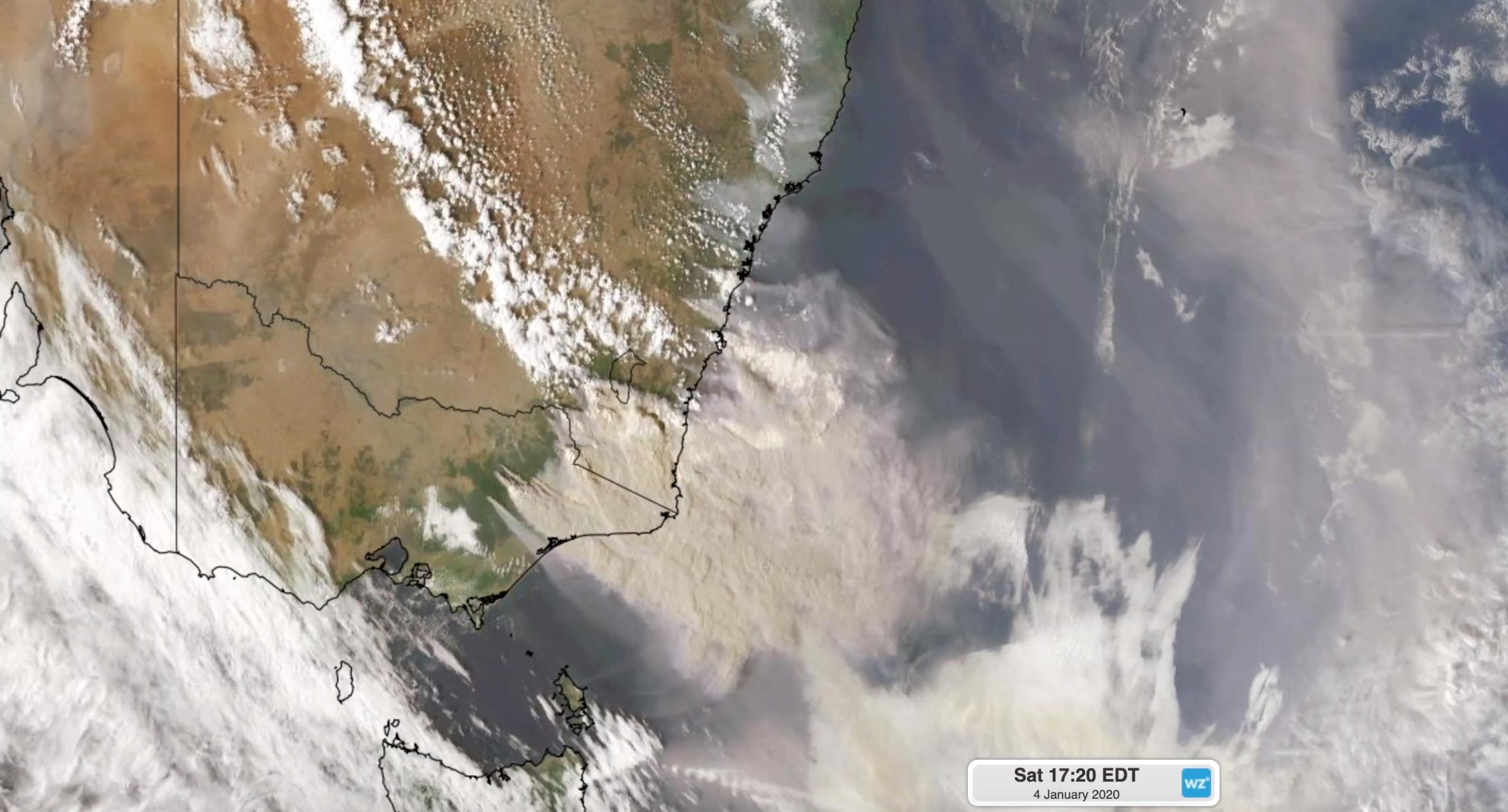 Image: Smoke from fires in eastern Victoria being blown across the Tasman Sea in early Janaury 2020.