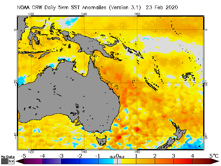 Image: Sea surface temperature anomalies on February 23rd, 2020. Source: NOAA Coral Reef Watch