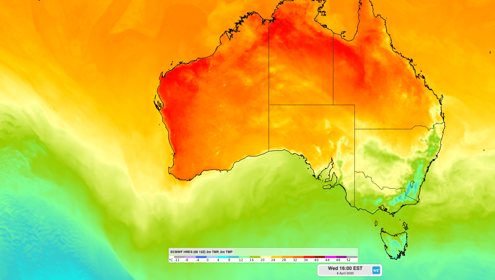 Image: Forecast surface temperature on Wednesdsay, April 8th, according to the ECMWF-HRES model.