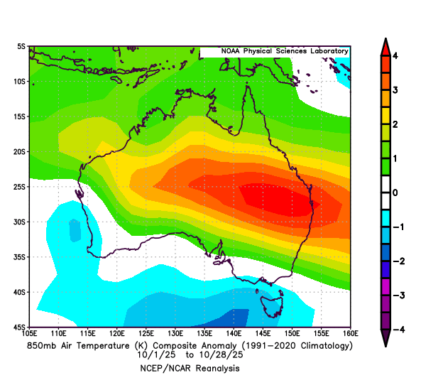 Image: Average 850 hPa temperature anomaly for the first 28 days of October 2025. Source: NOAA