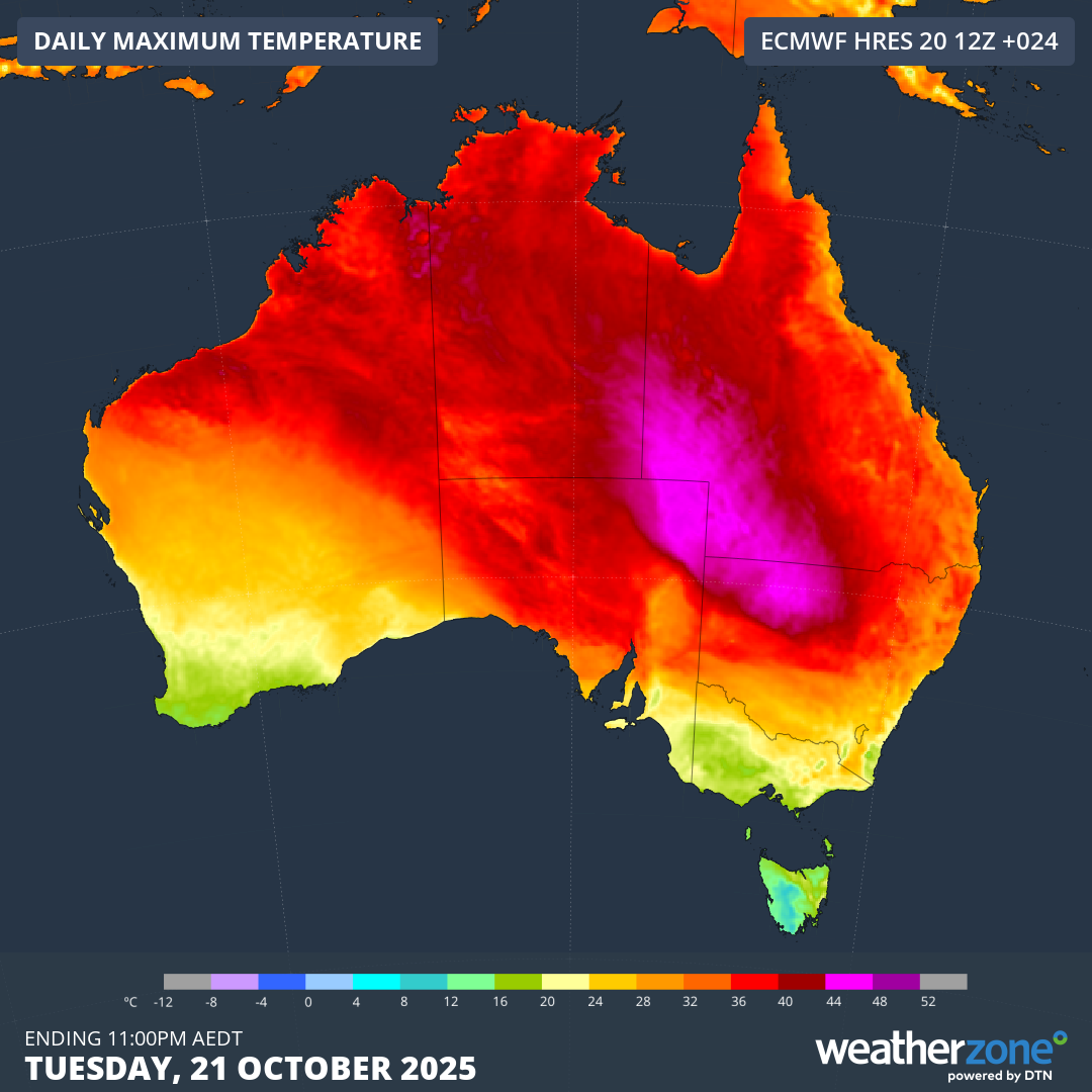 Image: Modelled daily maximum temperature over Australia on October 21, 2025, showing a pool of very hot air over the eastern inland.