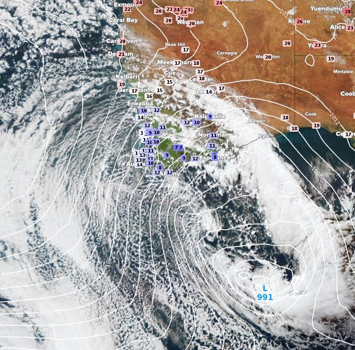 A complex low-pressure system, with a cold front and troughs accompanying it, is crossing southwest Western Australia, delivering winds that are typically only seen a couple of times a year in those parts of the country.