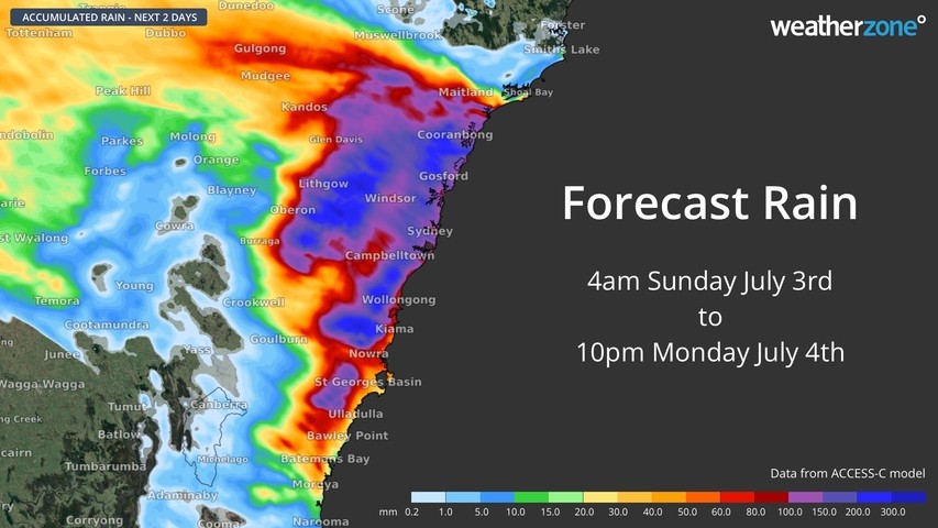 The heaviest rain between Friday and Sunday morning fell between Sydney and the Illawarra, where two-day rainfall totals reached 300 to 600mm in some places.