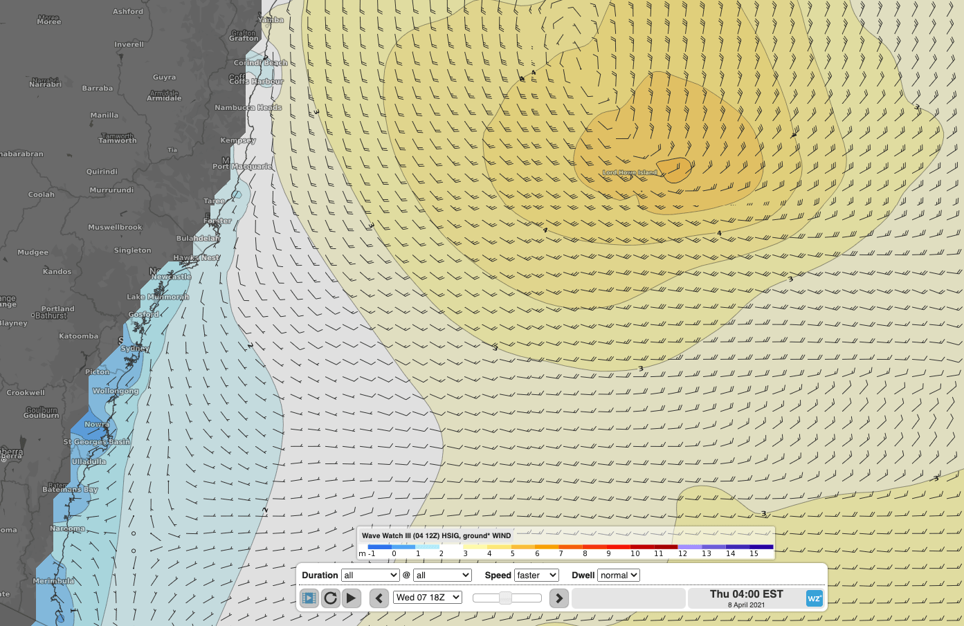 Image: Model showing offshore swell reaching 5-6 meters on Thursday morning generated by strong winds circling a low pressure system over the Tasman Sea. Surf from this source should bring an initial peak in surf on Thursday and Friday in the 3-4 foot range.