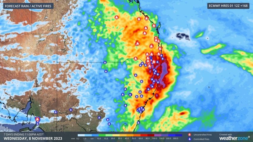 Image: ECMWF-HRES forecast accumulated rain between now and Wednesday, November 8, combined with the locations of active fires in NSW and Qld (valid at 10am AEDT on November 2).
