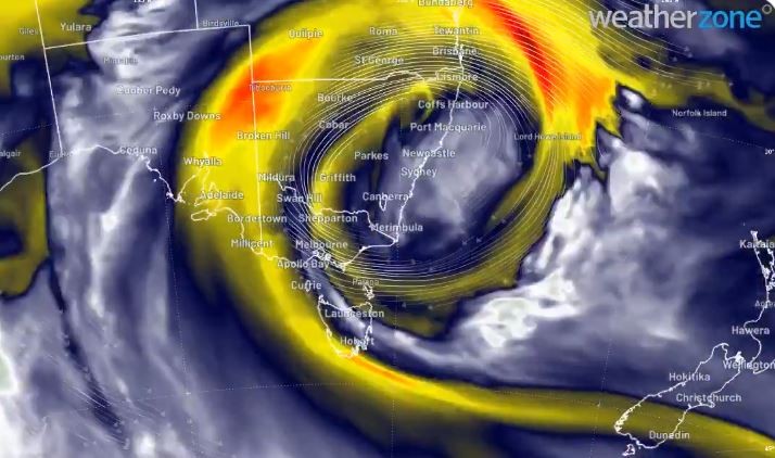 The cold air mass over south east Australia is becoming "cut off" from the polar flow. Subtropical air wrapping around the system's eastern flank will bring heavy rain to eastern VIC/TAS while the cold air continues on to produce snowfalls over parts of central and northern NSW. pic.twitter.com/4L3xJktdRj