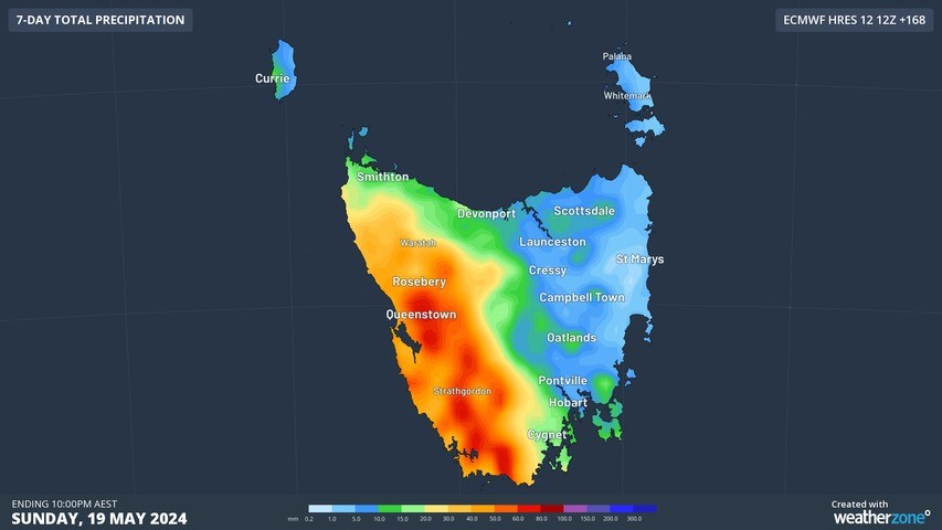 Hobart is not likely to receive heavy rain in this week’s weather pattern, so the state’s capital city will have to wait until late May or June for some decent rainfall.