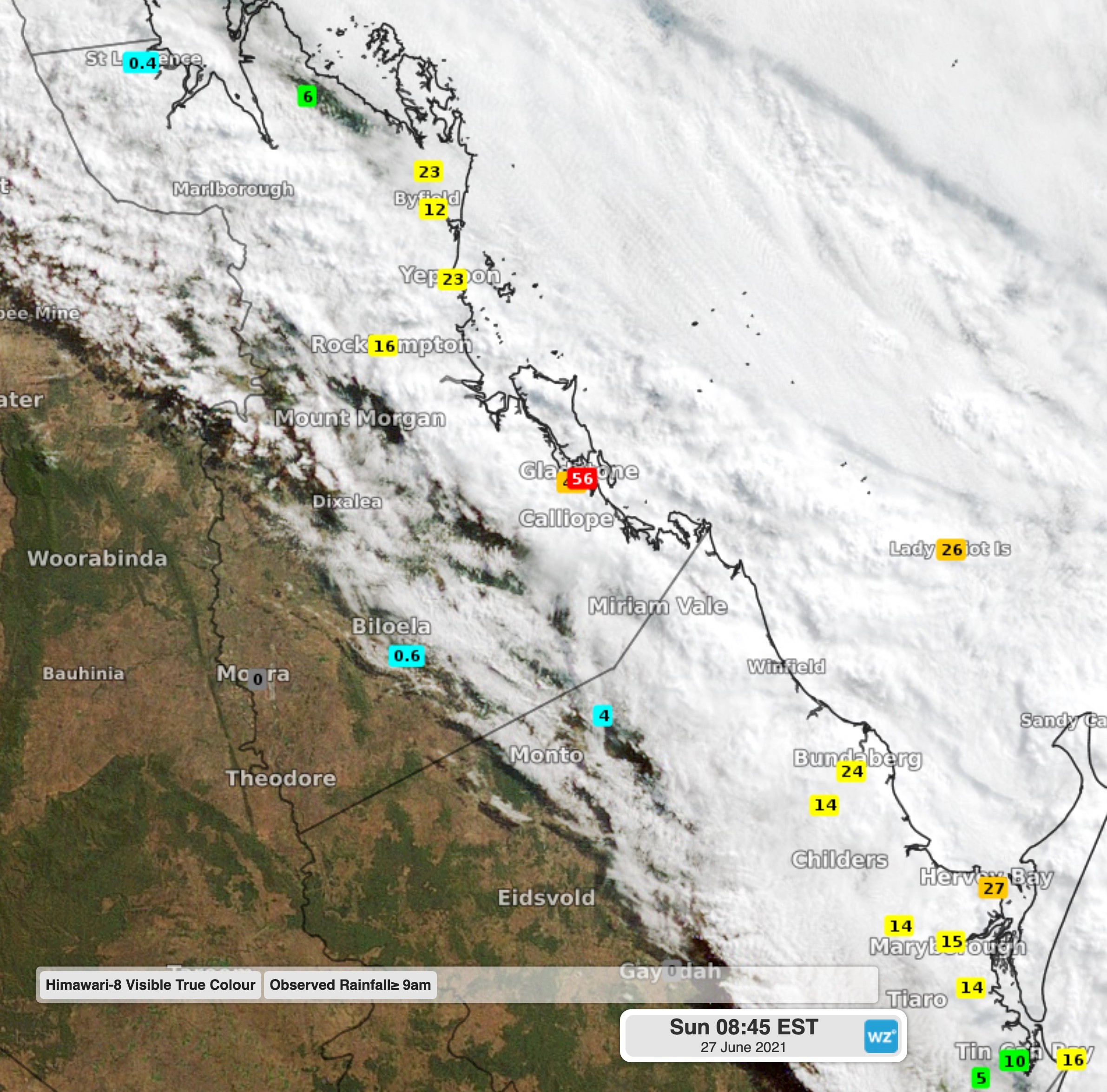 A northwest cloudband has slowly crept over the region during the last 30 hours, producing the heaviest June rain in 5 years for Gladstone (55.6mm), Bundaberg (24.2mm), Yeppoon (23.4mm), and Rockhampton (16.2mm). Some light falls are also occurring on Sunday morning, adding an additional 3-8mm into the gauges.