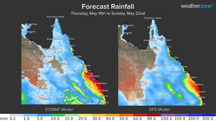 The map below shows how much rain two computer models expect to fall between now and Sunday night. While there is potential for 50 to 150 mm in some central and southeast coastal districts, there is uncertainty around whether the heaviest rain on Friday and Saturday will fall over land or out to sea.