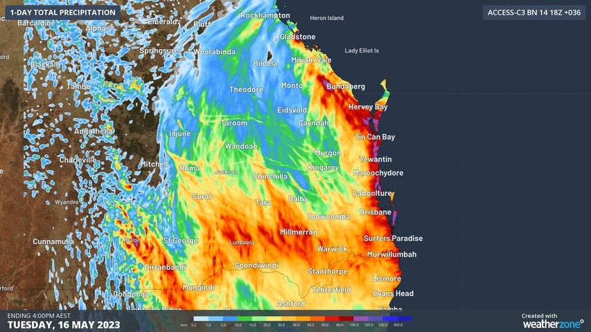 Image: Forecast accumulated rain during the 36 hours ending at 4pm AEST on Tuesday, May 16, 2023, according to the ACCESS-C model.