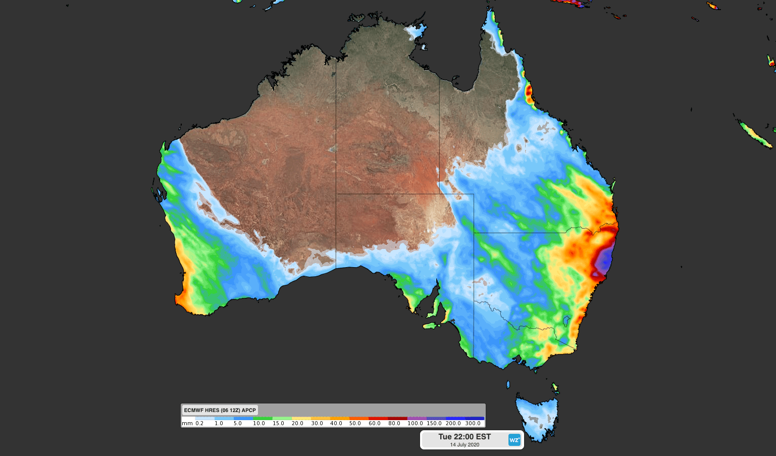 Image: Forecast accumulated rain between now and Tuesday next week, according to the ECMWF-HRES model.