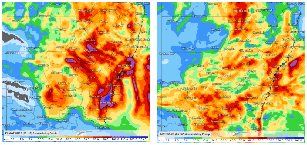 Image: forecast rainfall accumulation by 11pm Thursday 11th March according to the Friday 12z runs of ECMWF (left) and ACCESS-G3 (right).