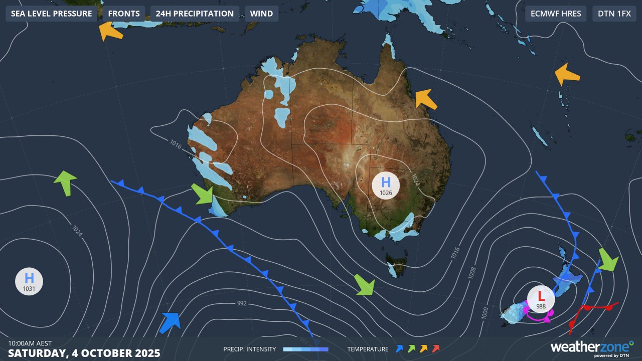 Image: Synoptic chart for Saturday, October 4, 2025, showing the large high pressure system over eastern Australia and the cold front approaching WA.