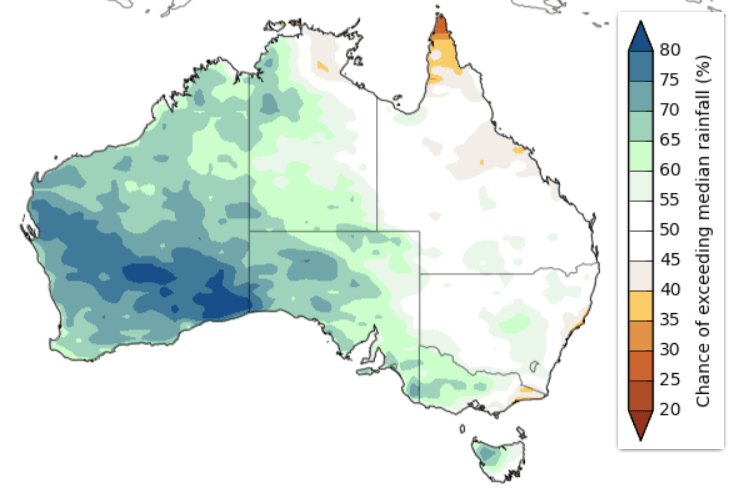 As a result, the three-month April to June rainfall is likely to be above average for Western Australia, western and southern parts of the Northern Territory, most of South Australia, western and central Victoria, and northwest Tasmania.