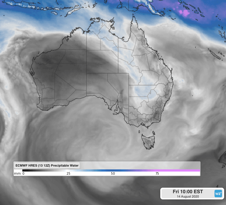 Image: Tropical moisture feeding the surface trough across eastern inland Australia on Friday.