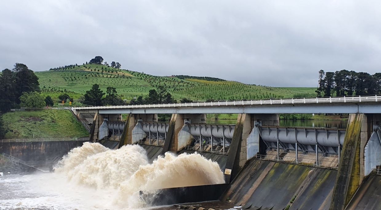 Image: Image: Water gushing out of Scrivener Dam on Canberra's Lake Burley Griffin. Source: Adam Shirley.