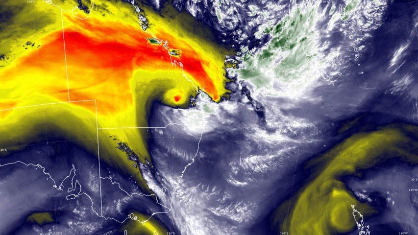 Image: Enhanced satellite and radar imagery showing low cloud (yellow) streaming into the system from the east, heavy rain falling over southeast QLD and northeast NSW, and high cloud in outflow (blue) being directed away from the system by upper winds.