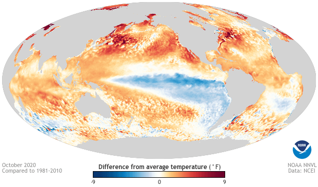 Image: Sea surface temperature anomaly during October 2020, showing a classic La Niña pattern in the Pacific Ocean. Source: NOAA / NCEI