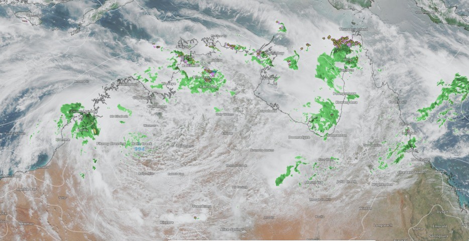 Tropical Cyclone Ellie was a brief-lived cyclone but there is nothing brief about the low she became. After strengthening to a category 1 cyclone (the lowest category of cyclone classification) that lasted only a few hours, Ellie crossed the western Top End coast south of the Daly River mouth early in the morning of December 23rd and became a tropical low. Since then, she has wheeled east to the Queensland/NT border and back to the Kimberley, all the while triggering storms and dropping intense amounts of rain.