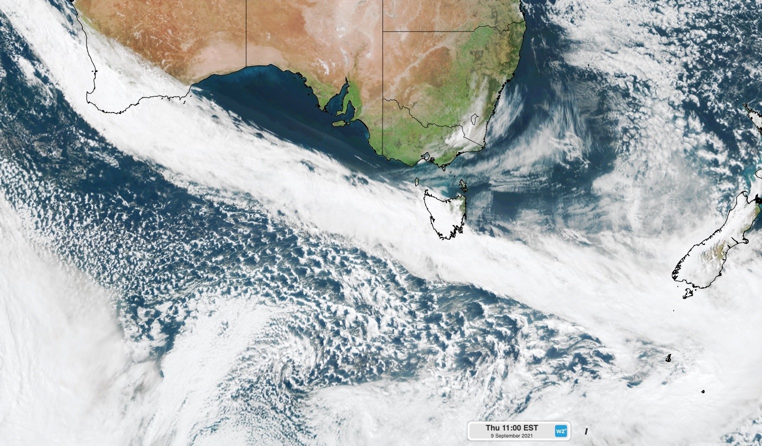 Image: Satellite image showing a cold front (thick band of cloud) near Tasmania on Thursday morning.