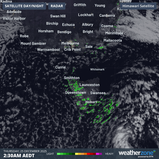 Image: Four-hour combined satellite and radar loop over Tasmania on the morning of Thursday, December 25, 2025.