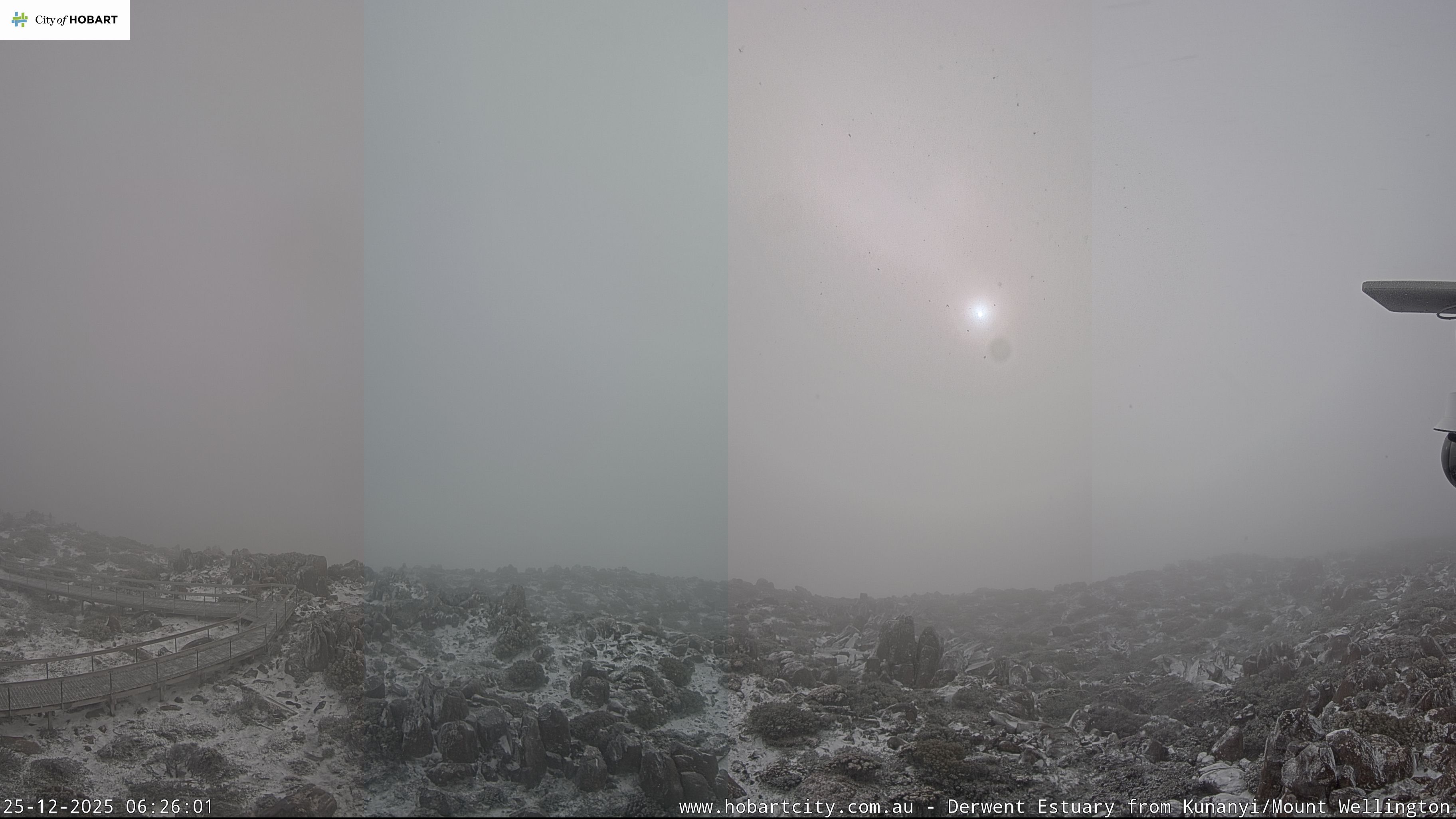 Image: The sun tries to break through snow-bearing clouds early on Christmas morning 2025 on kunanyi/Mt Wellington. Source: Hobartcity.com.au.