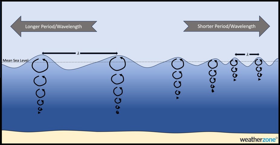 Huge waves generated from powerful storms a long distance away, like deep lows to the south of Australia in the Southern Ocean, propagate away from these strong wind areas as swell. The longer and farther a swell travels, the smaller it gets in amplitude, but the longer it gets in wavelength and wave period (the time it takes for two wave peaks to pass a point).