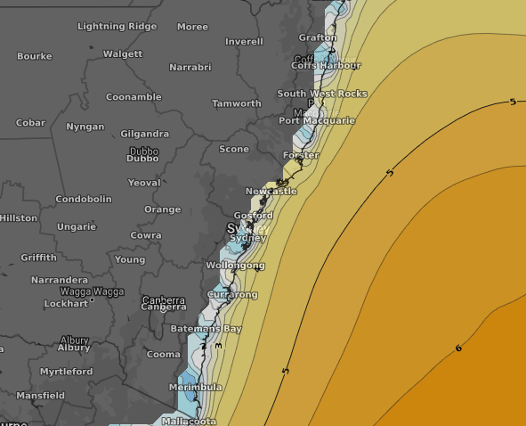 At 3am AEDT Saturday morning, 4.0 metre waves were recorded at Crowdy Head, along the Macquarie Coast. Late on Friday evening, Batemans Bay (3.4m), Eden (3.3m), Sydney (3.3m) and Port Kembla (3.0m) recorded similarly large waves.