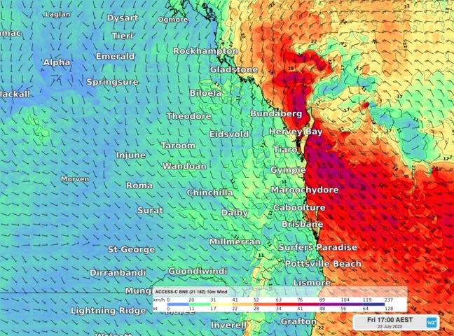 Some forecast models suggest that wind could become even more intense during Friday afternoon and early evening if the low drifts closer to the coast. If this does happen, wind gusts could reach around 110 km/h along the exposed coasts in southeast QLD.