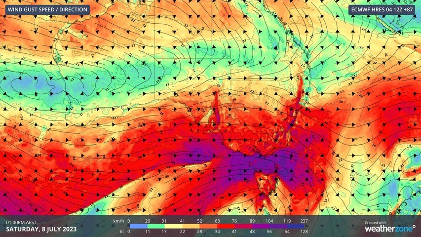 Image: Forecast wind gusts (speed and direction) at 1pm AEST on Thursday, July 6, according to the ECMWF-HRES model.