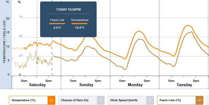 Figure 3: Hobart temperature forecast, where the orange line is temperature (Celsius), and the brown line is feels-like temperature