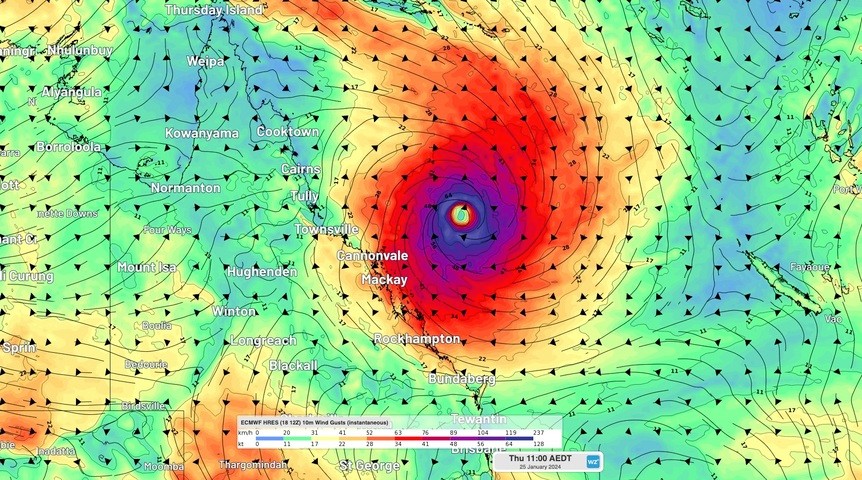 The wide spread of the lines on the map above highlights the high uncertainty regarding the future movement of this developing low pressure system. Roughly one third of the GEFS model’s ensemble forecast tracks cross the Qld coast, while the other two thirds remain offshore. This suggests that there is a 30-40% chance of Kirrily reaching the Qld coast and a 60-70% chance that it will remain offshore, according to this model.