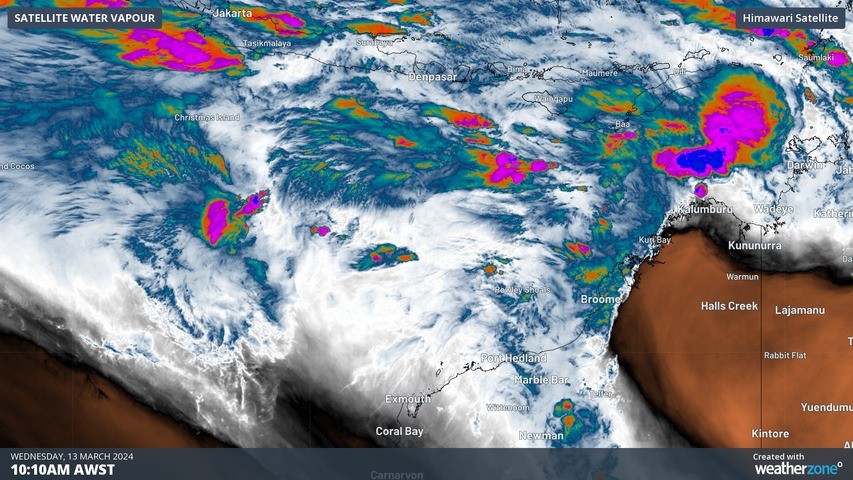 Image: Forecast track map issued by the Bureau of Meteorology Issued at 2:32am AWST Wednesday 13 March 2024. A more recent track map may be available. Source: Bureau of Meteorology