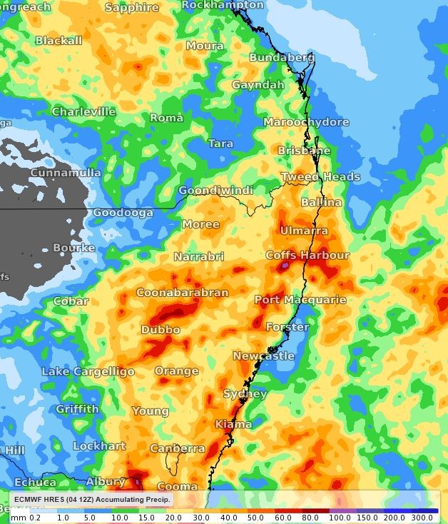 Image: ECMWF model showing accumulated precipitation in Australia’s east to Thursday 11pm EDT