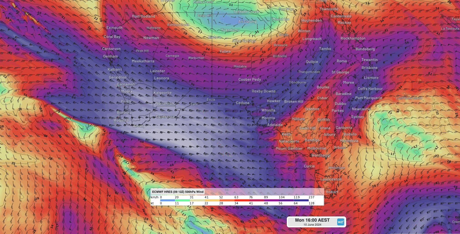 Image: Animation of forecast winds over southern WA and Australia this week at 500hPa (approximately 20,000ft) which help steer and enhance surface weather systems. Winds at 500hPa are indicative of jetstream winds above. Their position mostly north of southwest WA this week will allow both showery westerly to southerly winds to dominate over the southwest and also for passing cold fronts to push northward over some southwest land areas.