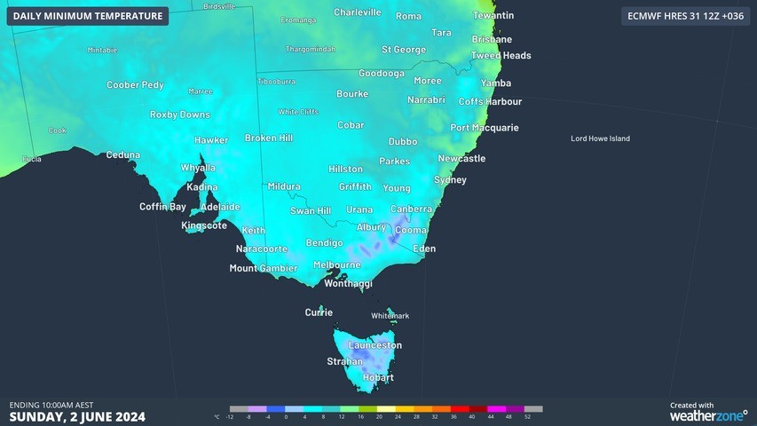 These freezing weather conditions will continue tomorrow over much of the southeast. The map below shows blue tons in Victoria, Tasmania, and much of South Australia and New South Wales, indicating minimum temperatures are below 8°C. It also shows areas in dark blue in eastern Victoria, southeast New South Wales, and Tasmania, indicating negative temperatures on Sunday morning.