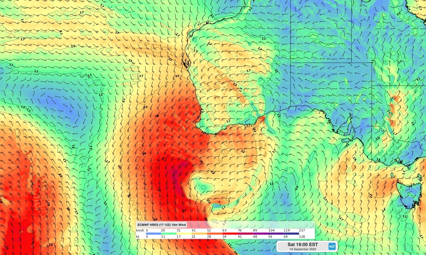 Behind the front, showers and gusty winds will persist through Saturday and Sunday as a complex low pressure system passes to the south of the state. The cold air being driven north by this low could cause thunderstorms and small hail over parts of the state's southwest on Saturday and Sunday, including Perth.