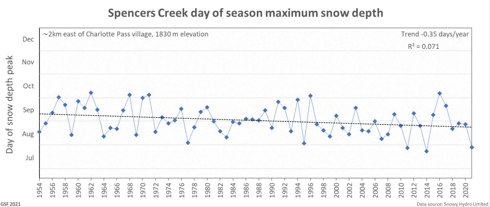 Image: Date of peak snow depth at Spencers Creek in each year since 1954. Note that 2021 is already plotted, even though a heavy spring snowfall could change things. Source: @gergyl on Twitter, an engineering hydrologist who loves playing with data and is a friend of Weatherzone!