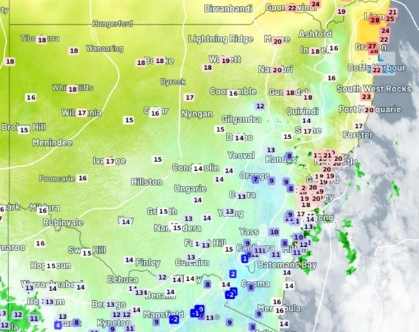 That cool air has not yet quite penetrated to the far north-east corner of the state, but it's not too far off, and will arrive later today or overnight, with weekend top temps at most spots in the northeast (below the tablelands) expected to reach the low twenties on Saturday and only the high teens on Sunday.
